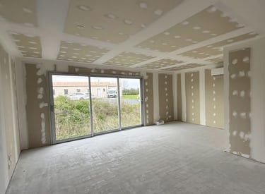 Travaux de plâtrerie et peinture dans une maison individuelle en cours de transformation, avec création de nouveaux volumes et finitions contemporaines.